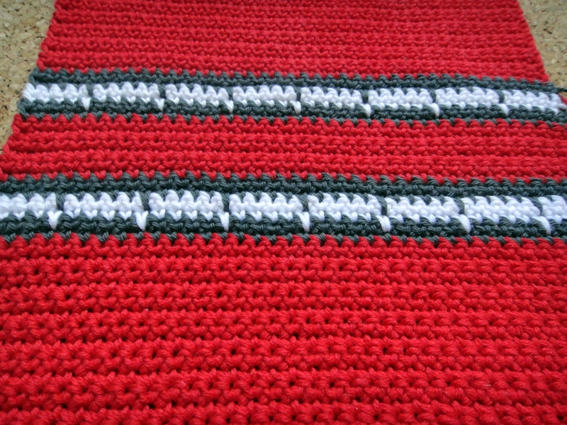Vueltas 1 a 16: Con rojo, 39 puntos bajos. 1 pcad, girar. En la vuelta 16 cambiamos al hilo gris en el último pcad.