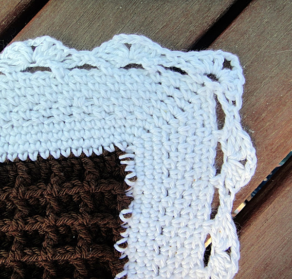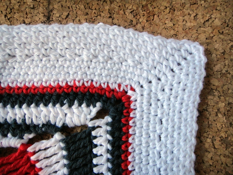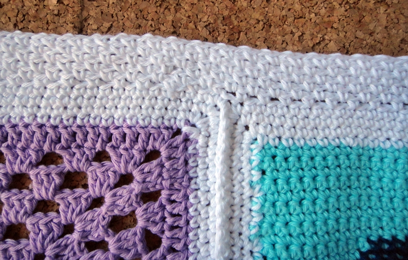 Cuando ya tengamos todas las filas unidas, seguimos con el hilo blanco para hacer un borde decorativo a toda la colcha.