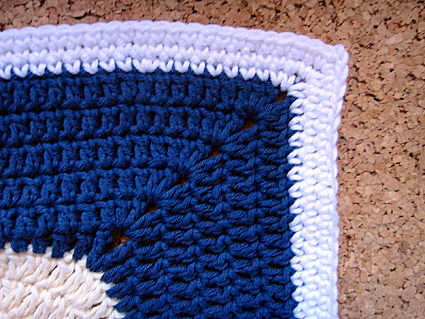 La primera vuelta tiene 40 pb en cada lado, con 2 pcad en las esquinas. Las dos siguientes, hacemos un pb en cada punto de la vuelta anterior, haciendo 1 pb, 2 pcad, 1 pb en las esquinas.
