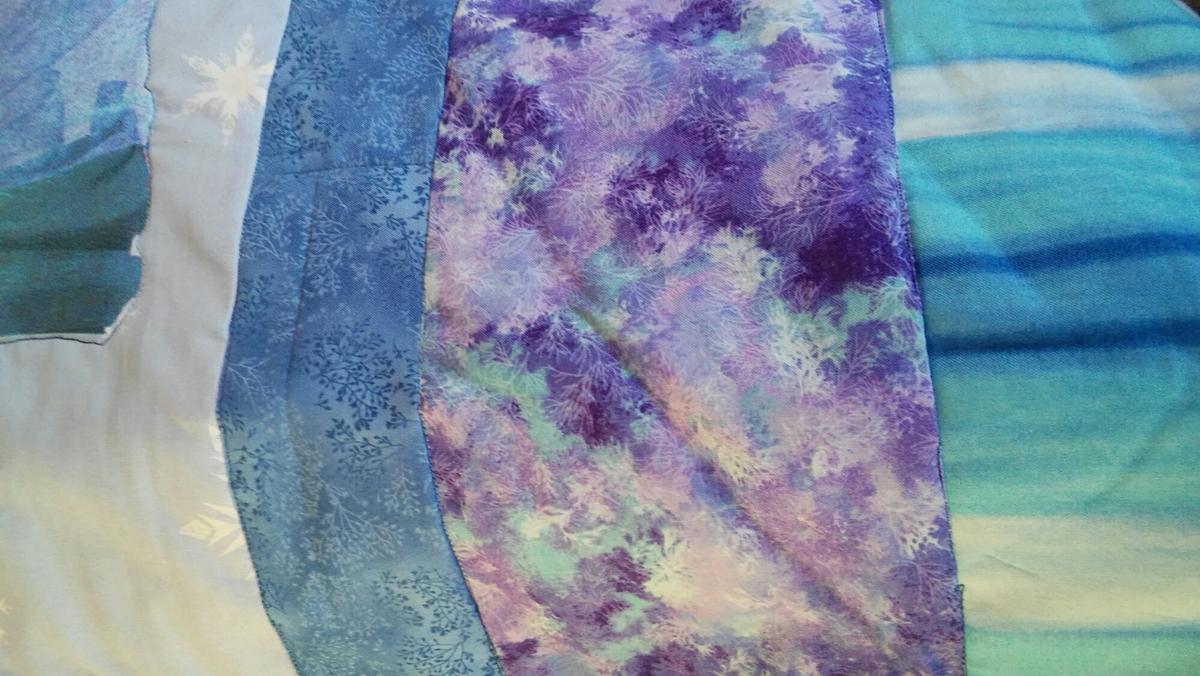 Todos los personajes como Anna, Elsa, Olaf, Sven están durmiendo con ella todas las noches con ésta colcha nórdico que le hice de patchwork.