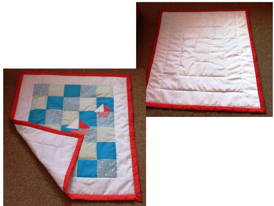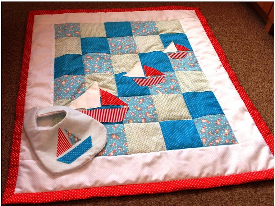 Como veis, esta hecha a base de cuadraditos unidos entre si, y el acolchado es simple. Lo de los barquitos como aplicación es porque los papis son los dos de navales, así que me ha venido bien, porque los barquitos son fáciles de hacer. :-)
