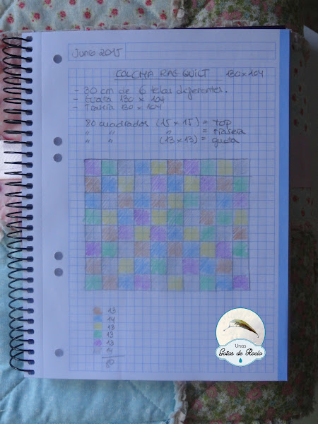 He usado 30 cm. de 6 telas diferentes de 1,10 cm. de ancho, cortándola en cuadrados de 15 x 15 cm. En total han sido 80 cuadros, con lo que la colcha mide 130 x 104 cm. La guata que he usado es de algodón y para la trasera he elegido una única tela.