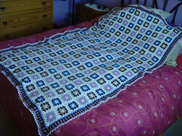 Os quiero enseñar la colchita que por fin he terminado para mi amiga Cris, ella trae una niña aunque aún no está segura del nombre que tendrá seguro que va a ser igual de coqueta y presumidilla que su mami, por eso, y porque le pega completamnete con su habitacion en tonos blancos y lilas he escogido estos colores para su colcha, la verdad es que la empecé cuando aún no sabía si sería niño o niña, pero mira, me ha salido bien la jugada.