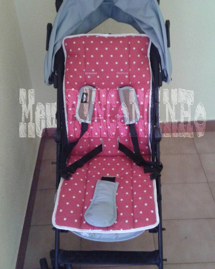 Para los ojales me guié por los que trae la colchoneta que da color a la silla... Le puse una goma abajo para sujetar en el reposapies y una especie de solapa arriba
