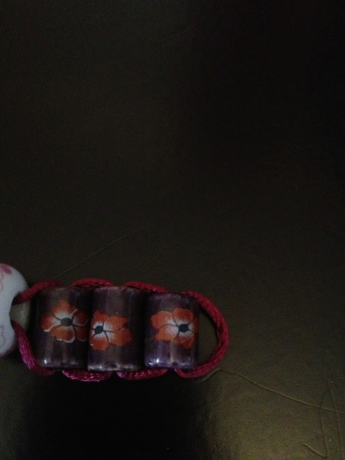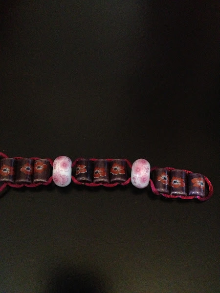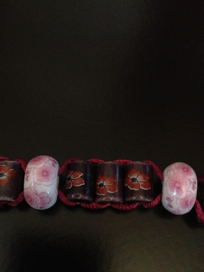 Realizada con cuentas de cerámica/porcelana blancas con motivos florales en rosas y piezas color berenjena con flor roja entrelazadas en un hilo color borgoña tipo seda que se le denomina cola de ratón, es un hilo suave y agradable.