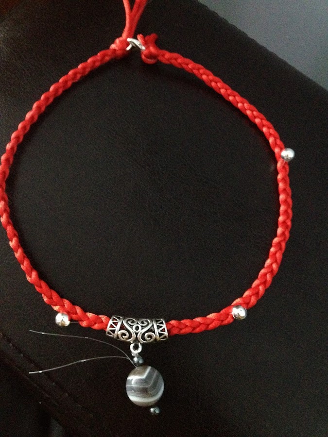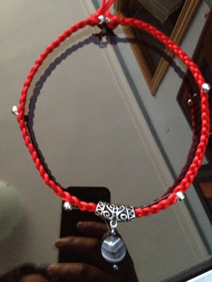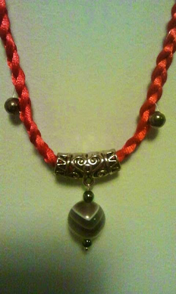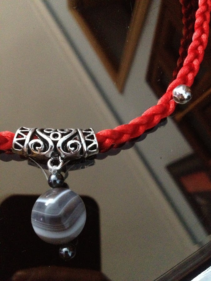 Y decidí comprarla para ponerla como colgante y me surgió la idea de algo para la colección China, el gris y el rojo combinan bien y por la forma de bola de la piedra queda como si fuera un cascabel de un gato.