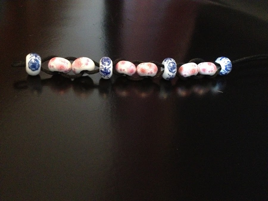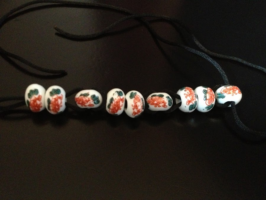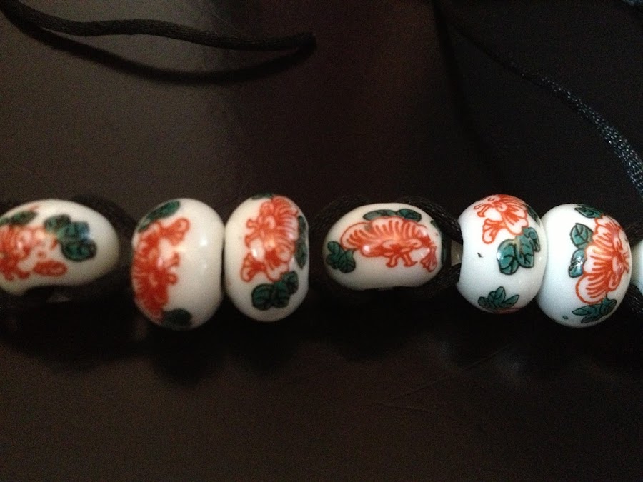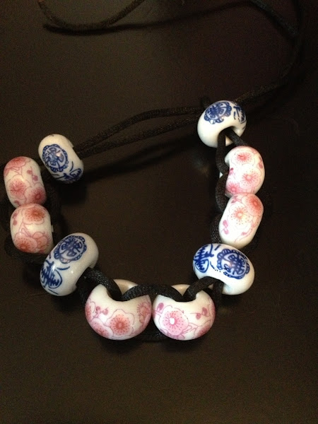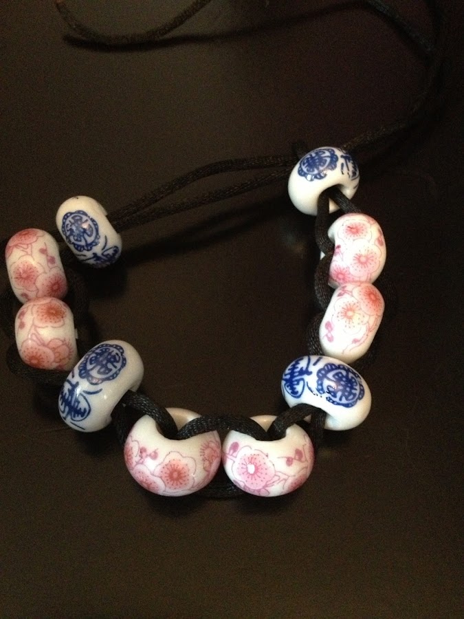 Hecha con piezas de cerámica con motivos florales en rosa y motivos chinos en azul, enfiladas en hilo negro "cola de ratón".