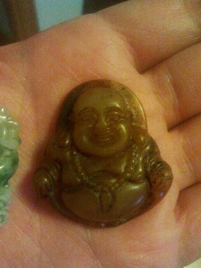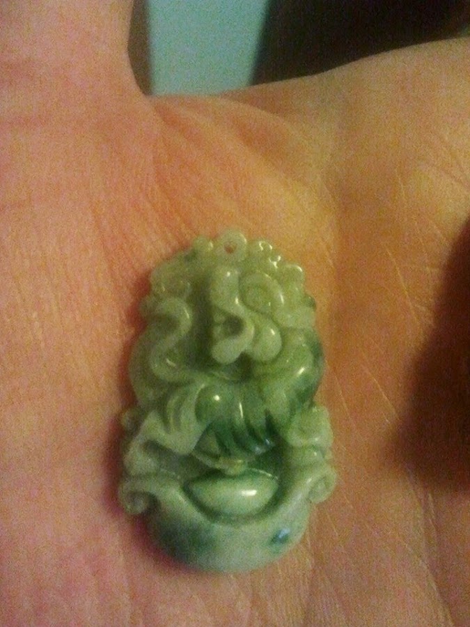 Y este colgante de piedra en forma de dragón lo compré por "Jade" pero tengo que llevarlo a la tienda de minerales a que la gemóloga o el gemólogo me lo verifique, pues no sé si será ágata, un ágata verde, no estoy segura. Como hay tantas imitaciones... puede ser serpentina, aventurina o un ágata en vez de un Jade auténtico.