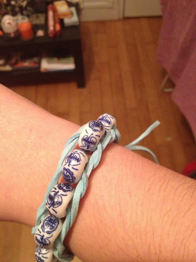 Hecha con piezas de cerámica con motivos chinos en color azul oscuro, enfiladas en un hilo de piel vuelta sintética color azul celeste.