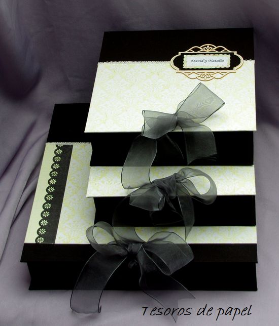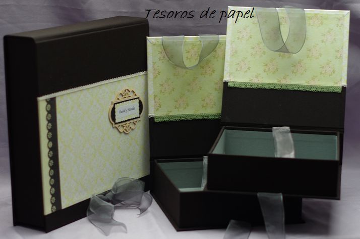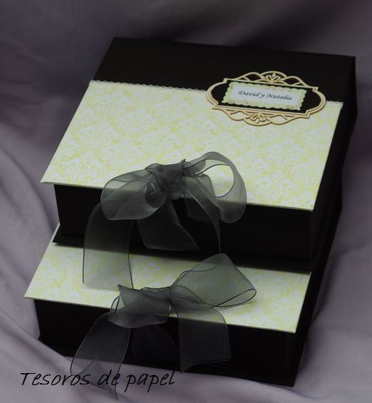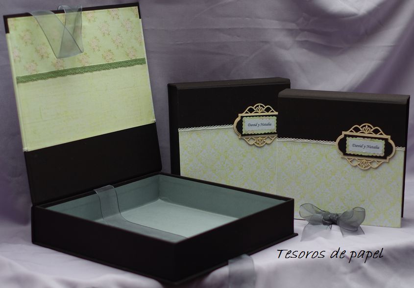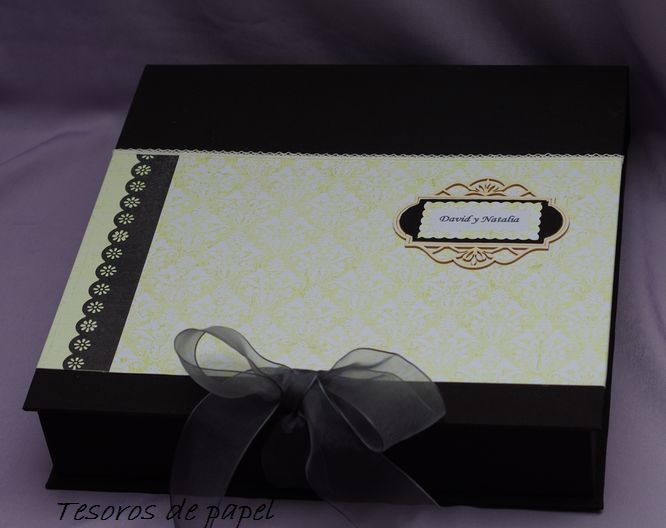 Él es fotógrafo, principalmente de bodas, y quería entregar a los novios su reportaje fotográfico y albumes de fotos de una forma especial y más personalizada.... Asi que se puso en contacto con nosotras (ya hace unos meses) para hacer estas cajas.
