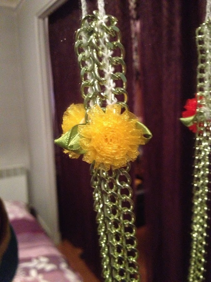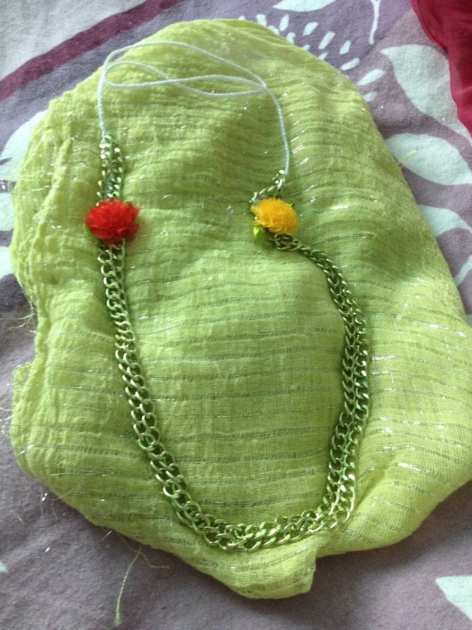 Lleva una cadena de aluminio en color verde hierba, y le cosí dos flores de mercería hechas con tela de organza en colores amarillo y rojo.