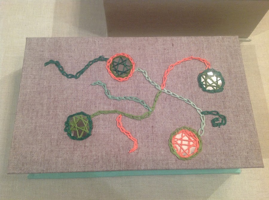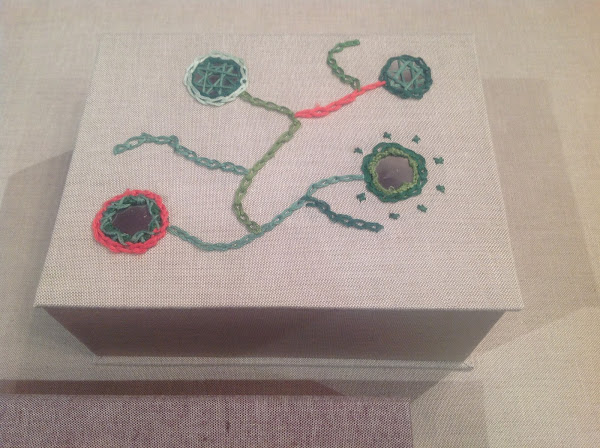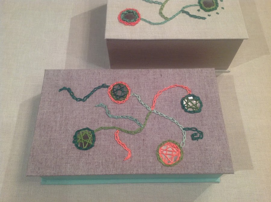 Cajas realizadas con la técnica del cartonnage, bordadas a mano