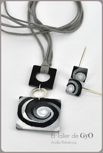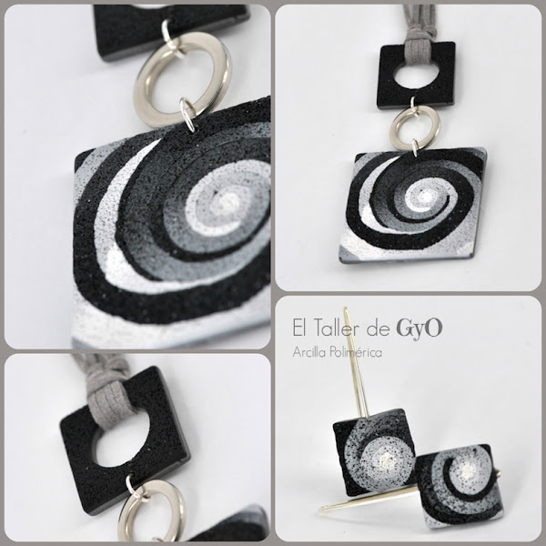 Colgante corto combinado con pendientes botón. Negro-blanco-gris-plata.