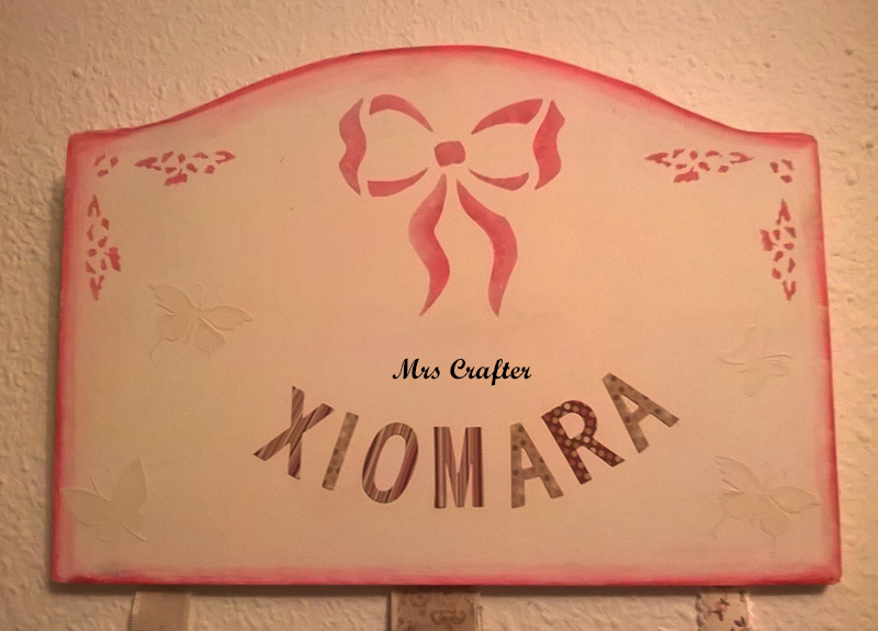 La mamá de Xiomara quería un soporte donde colocar el montón de diademas, horquillas y gomas para el pelo.Esta es la idea que ella tenía y a la que he dado forma: Chalk paint color merengue, flotado en rosa, algún stencil y mariposas con pasta de relieve sobre esta tabla de la que cuelgan unas cintas con bucles donde colocar todos estos "accesorios".
