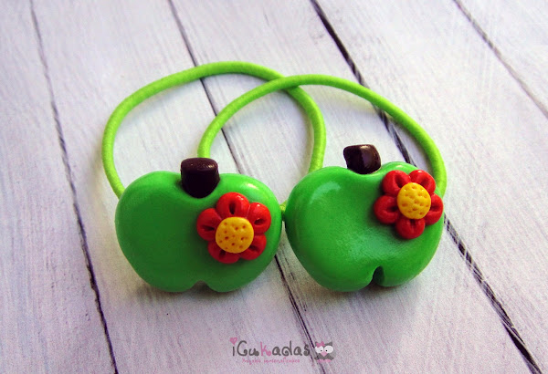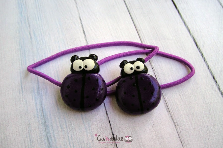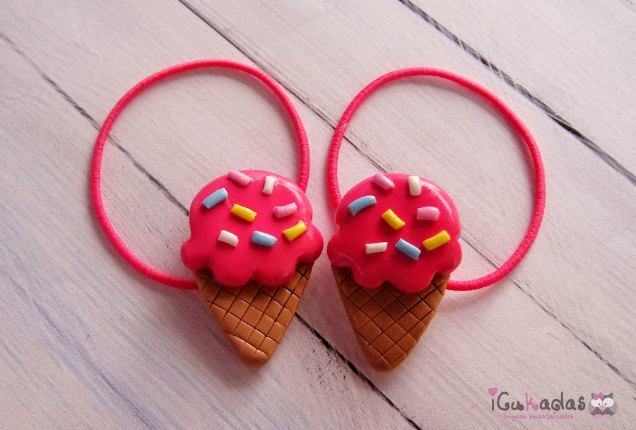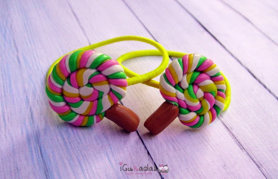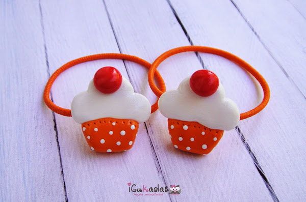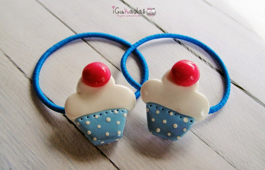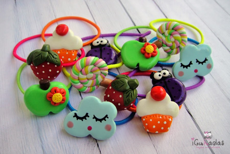 Son de fimo, como podéis ver, nubes, cupcakes, piruletas, de todos los colores para combinar con la ropa de las peques y alegrarles las coletas.