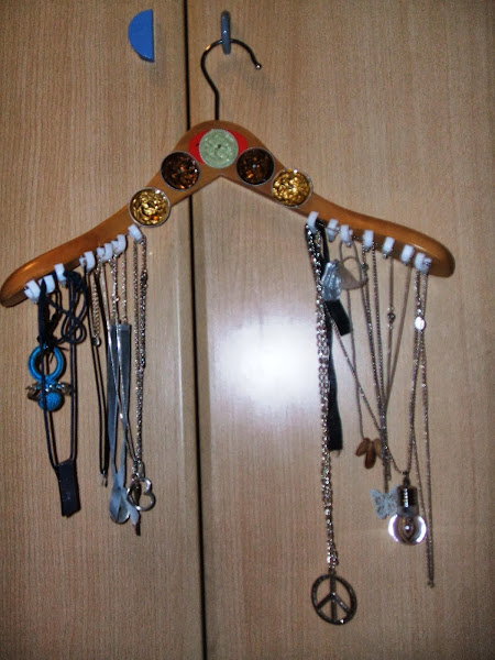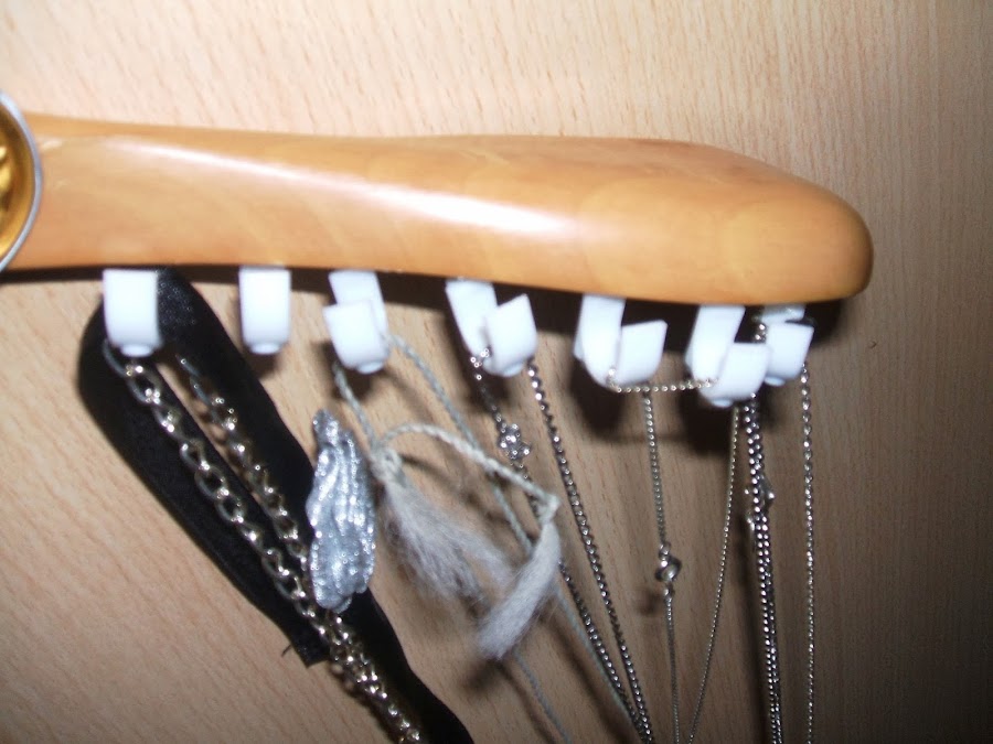 Una percha que no utilizas, unos recoge cables y unos adornos de la casa y ya tenemos un colgador para la bisutería. Una forma muy práctica de tener todos los collares bien ordenados.
