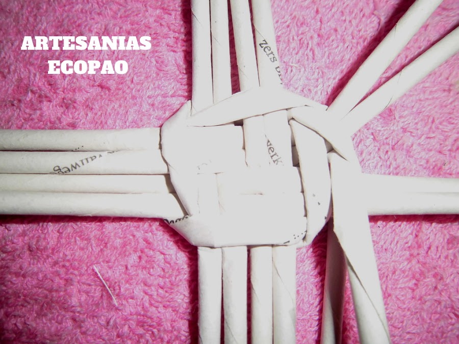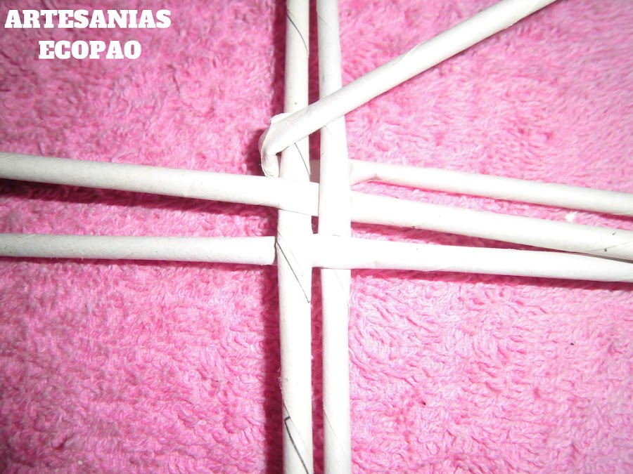 Entrelaza 4 rollitos, formando una "+" en el centro y con otro rollito comienza a tejer. Haz una vuelta de a 2 rollitos y a continuación, separa cada uno.