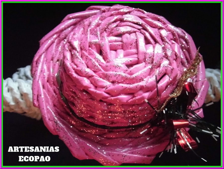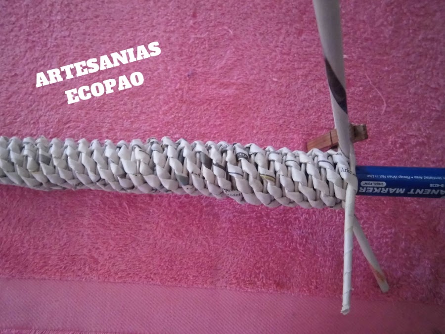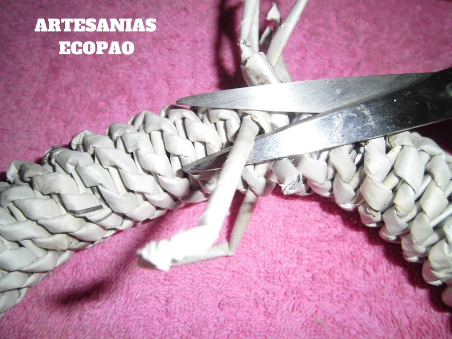 Yo le di 3 vueltas. Corta y esconde los 2 rollitos con que tejimos, aplica pegamento.