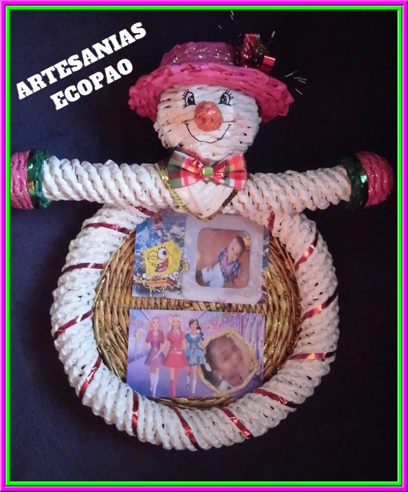 Otra utilidad, seria usarla como porta fotos. Para esto teje una base normal y después de pintar ubícala en el espacio del centro del muñeco, a continuación ya puedes colgar tus fotos.