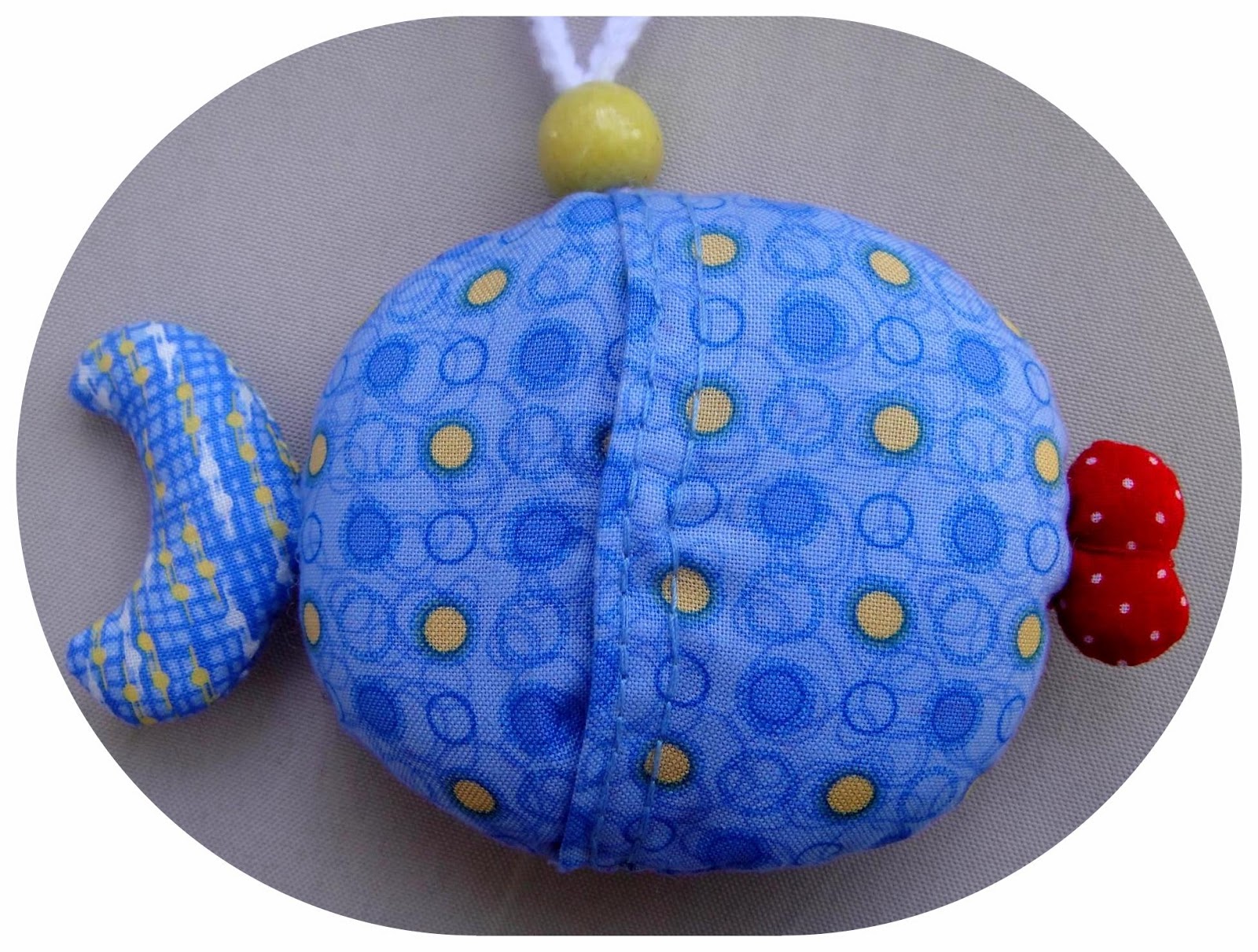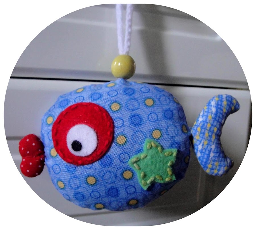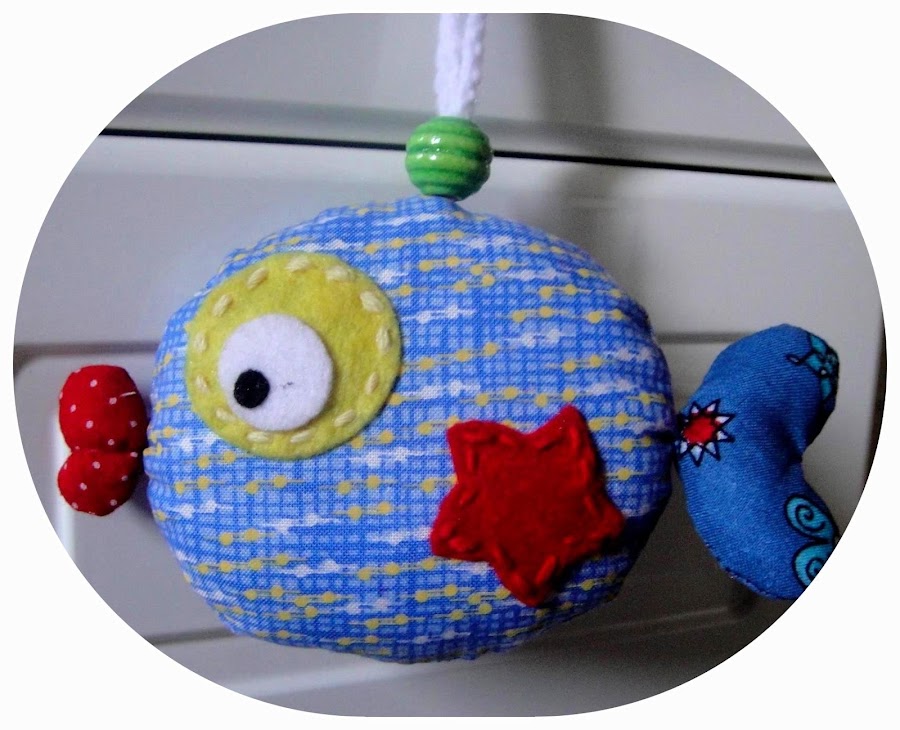 Esta vez he hecho unos peces, bueno, esta y alguna más, pero se pueden hacer corazones, casitas, o estrellas de tela, y en un momento tenemos un armario enorme que ocupa toda la pared convertido en un rinconcito decorado.