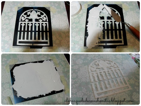 La plantilla la hice con la Silhouette Cameo, y me pareció sencillísimo de hacer: simplemente, pones la plantilla, echas la pasta con una paleta, y una vez lisito, retiras la plantilla. Y se queda como ves en la última imagen de la composición de arriba,