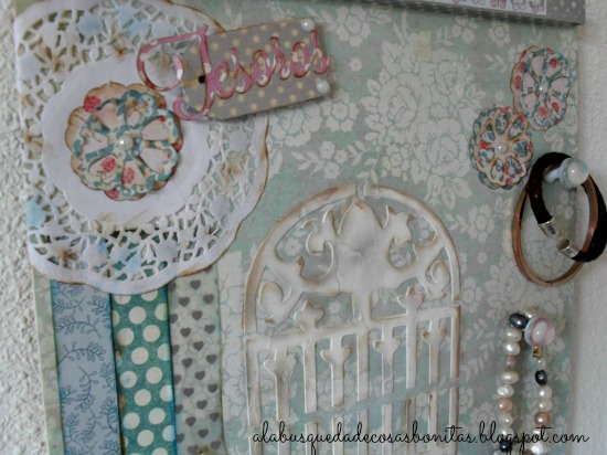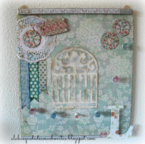 Y yo, participo con este Colgador de pulseras como si fuera un layout decorándolo con dos técnicas: la pasta de relieve, y con recortes de papel (lo que viene siendo el scrapbooking )