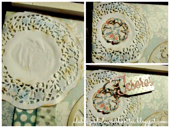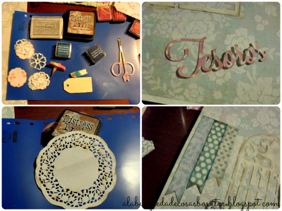 Aquí también tiré de la Cameo para recortar las flores y la palabra "Tesoros", de las tintas para dar volumen e incluso de una blonda de pasteles que entinté para que resaltara.