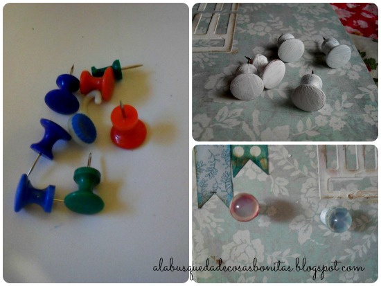 Y claro, para colgar las pulseras necesitaba algunos pomos. Y recordé que tenía unas chinchetas con cabeza de plástico... Les dí una capa de gesso y para rematarlas, unos embellecedores hechos con los topes de silicona...