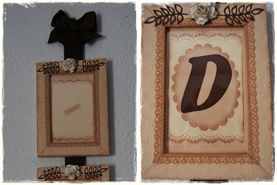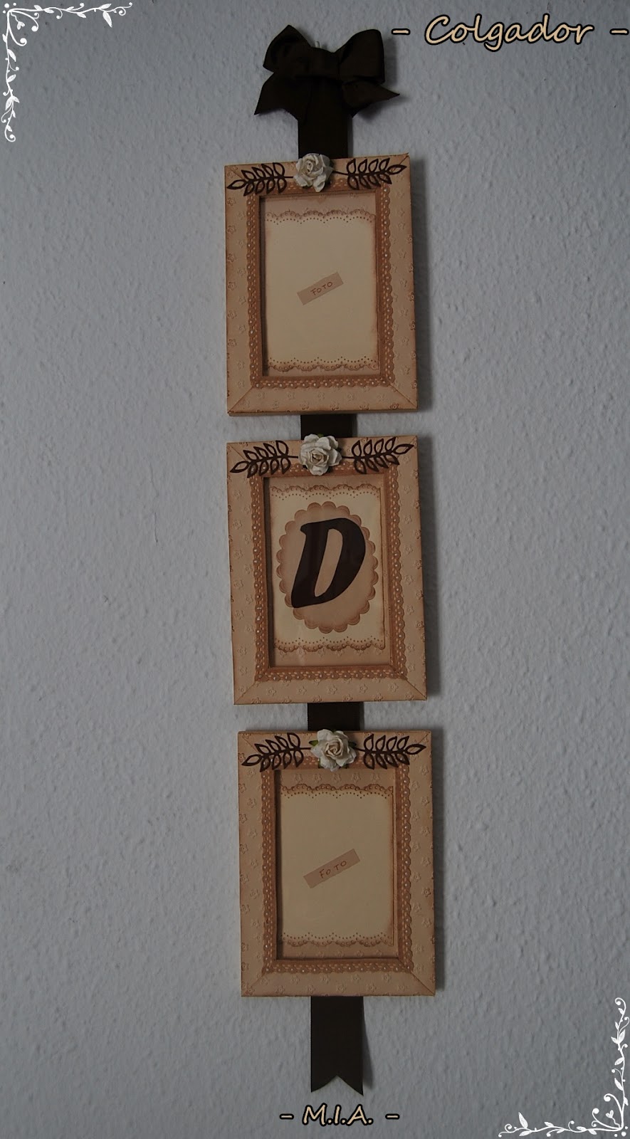 Tres marcos RAM montados sobre lazo marrón para colgar en la habitación. En el del centro he puesto la inicial del nombre y los otros servirán para poner fotos del bebé.