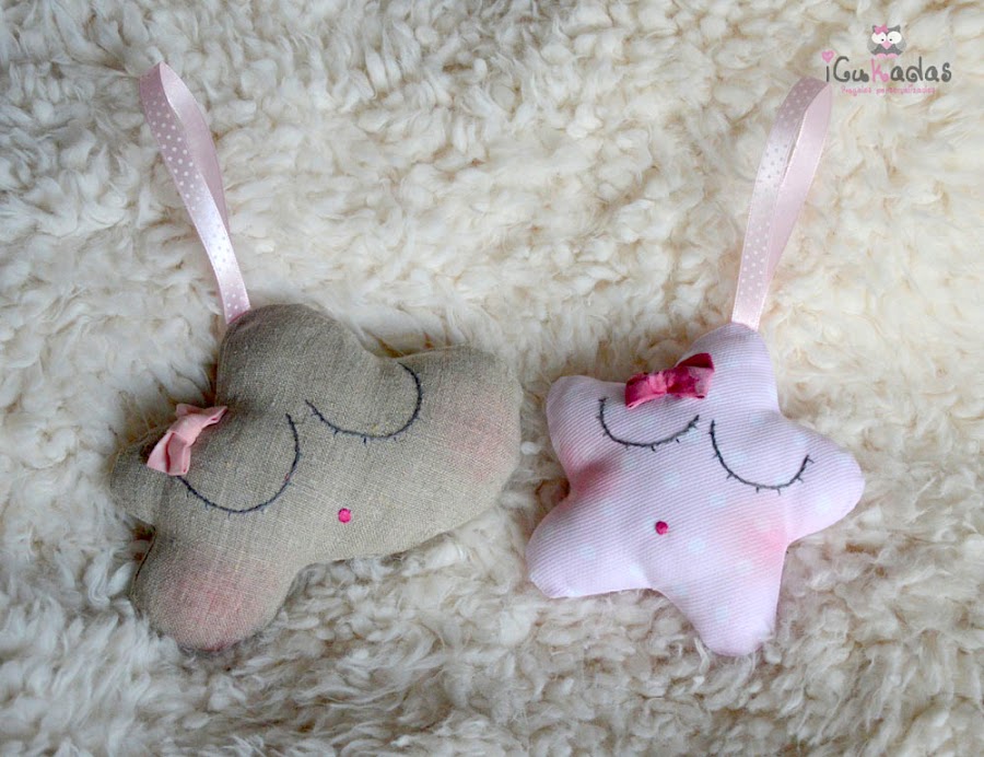 Una nube gris y una estrella rosa, que se pueden hacer igual que los cojines, en otros colores, nube en blanco, estrella en azul.