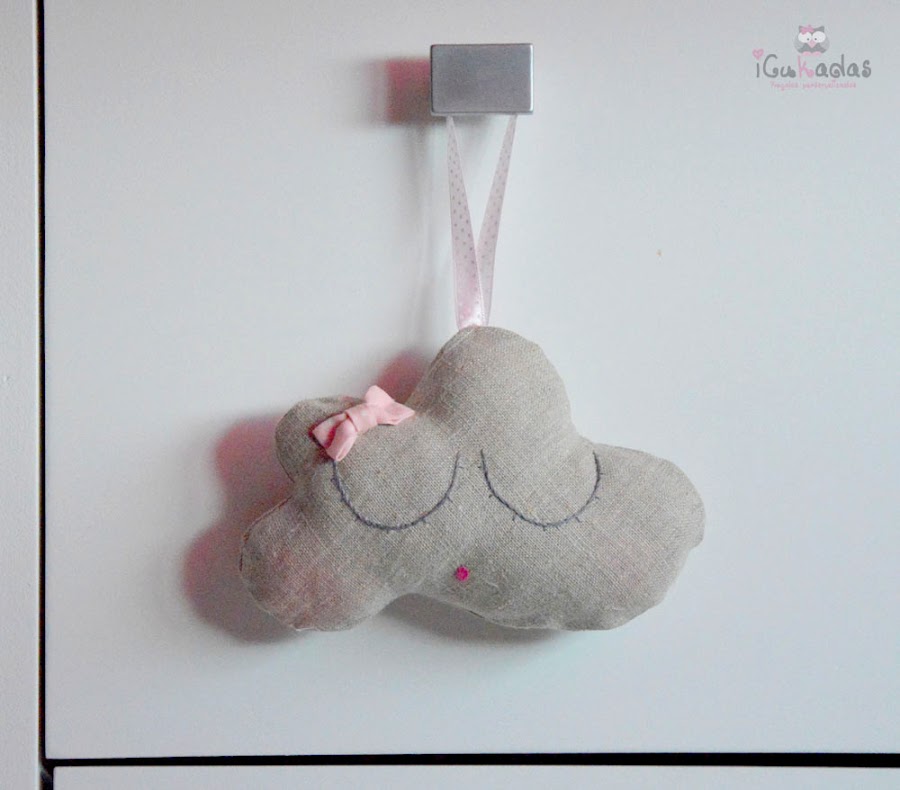 Y ahora os los enseño en su nueva versión, como colgadores para los tiradores de las puertas o de los armarios, o para colgarlas donde os de la gana, a juego con los cojines de cuna, pero en tamaño mini para decorar la habitación.
