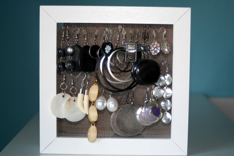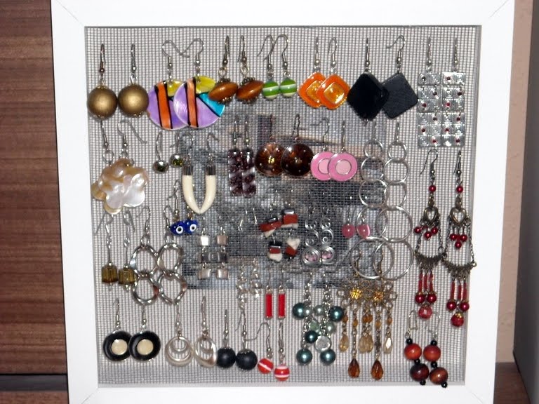 Para organizar los pendientes "colgantes" (por llamarlos de alguna forma), empleamos un marco Ribba de Ikea y un trozo de malla de mosquitera. Lo único que hay que hacer es quitar el cristal que trae el cuadro y en su lugar poner el trozo de mosquitera bien tirante y graparlo al bastidor de madera que tiene en el interior.