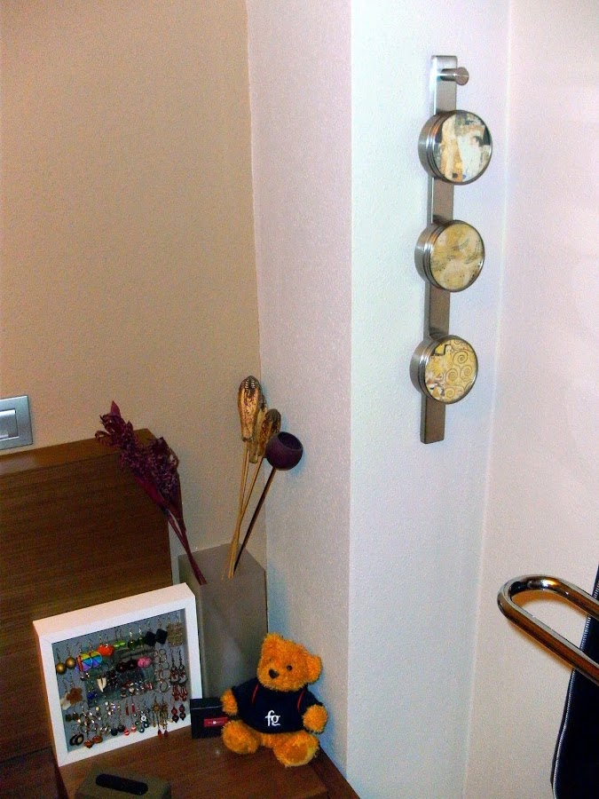 Para el resto de pendientes, que son los que no se pueden colgar en la malla, se me ocurrió emplear unos especieros Grundtal de Ikea con su soporte magnético, que son los que aparecen sobre los cuadros. Los pendientes van colocados dentro de los especieros pinchados sobre un trozo de "esponja" de la que se emplea para realizar centros de flores.