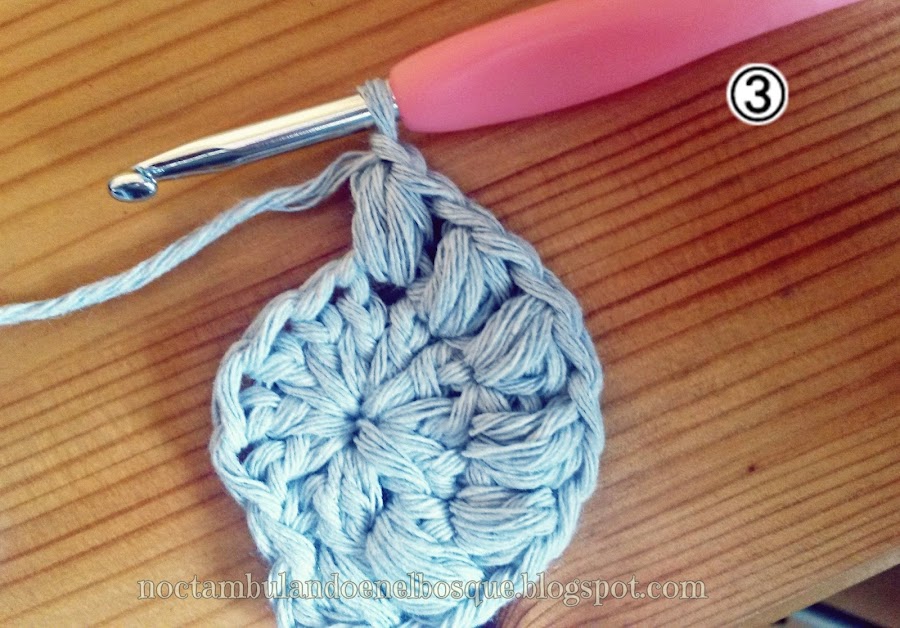 - En la siguiente vuelta empezamos con 3 cadenetas, cogemos lazada (sin cerrar) y volvemos a coger lazada, cerramos todo a la vez y separamos con una cadeneta. Aquí estamos haciendo punto garbanzo. Por lo que vamos a hacer un punto garbanzo (de 3 lazadas) en cada punto de la vuelta anterior separados por 1 cadeneta.