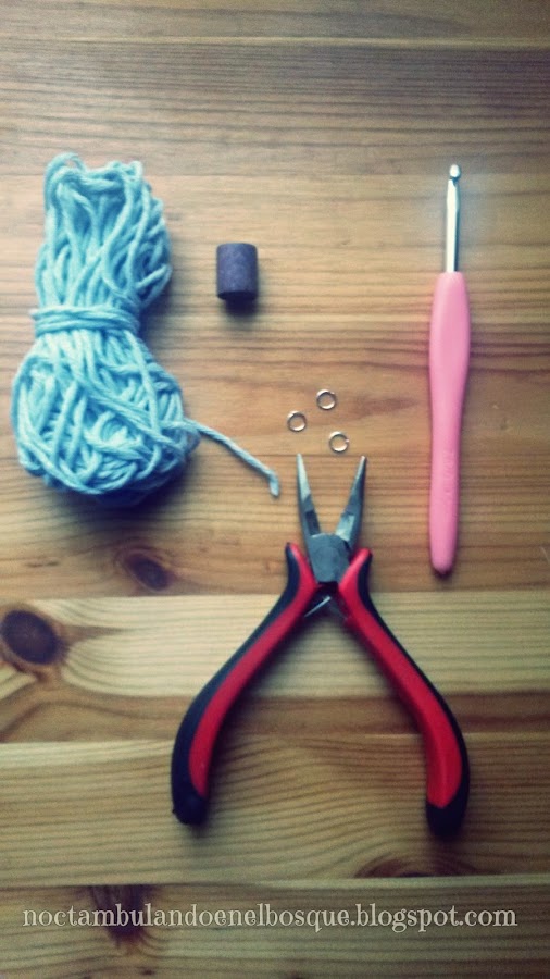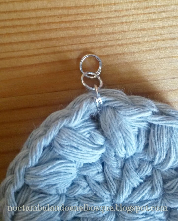 - Ahora pasamos al cordón. Uniremos las 3 argollas con la ayuda de unos alicates tal y como se ve en la foto de abajo. Como el algodón que utilicé es bastante grueso, opté por no hacer cadenetas para el cordón, simplemente corté hasta el largo que me quise y lo anudé.