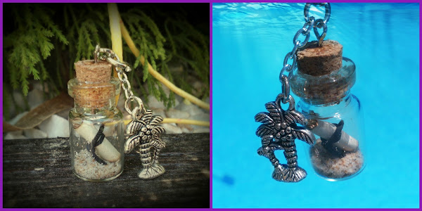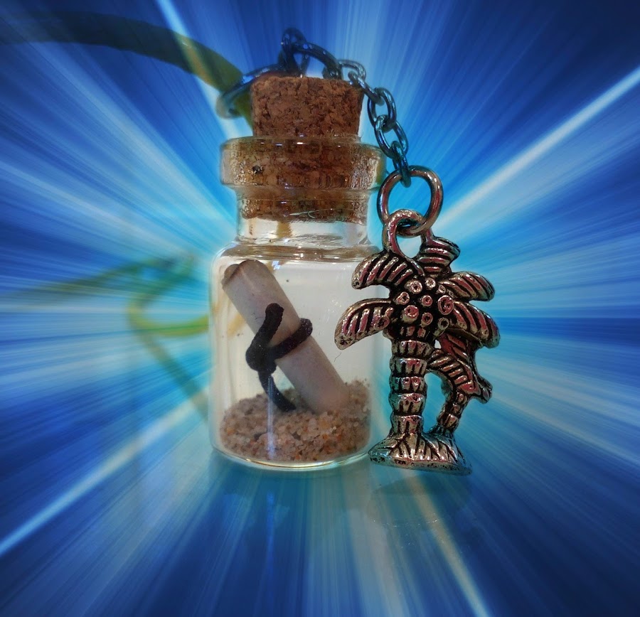Hace tiempo que no hago colgantes de botellitas de cristal y ahora en verano he hecho uno que le va que ni pintado a esta estación. Lo he llamado "Un mensaje en una botella", ahora con las fotos lo entenderéis: