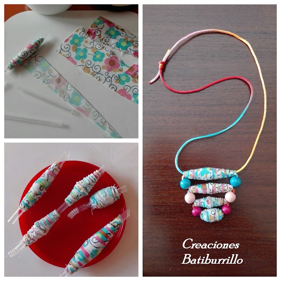 Para hacer las cuentas de tela, cortamos tiras triangulares bien largas, las enrollamos sobre sí mismas alrededor de una pajita de plástico, cubriendo todo el revés de la tela con cola blanca para que se adhiera y adquiera consistencia. Por encima también usamos cola blanca que al secar quedará transparente.