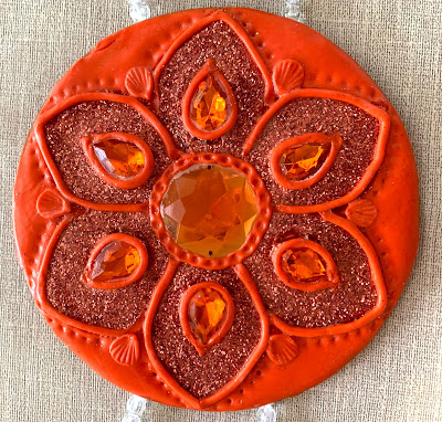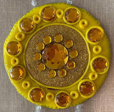 Y entre los pétalos pegue pequeñas bolitas de porcelana aplastadas con un punzón con una esfera mas grande. Y así me quedo terminado el tercer chakra.