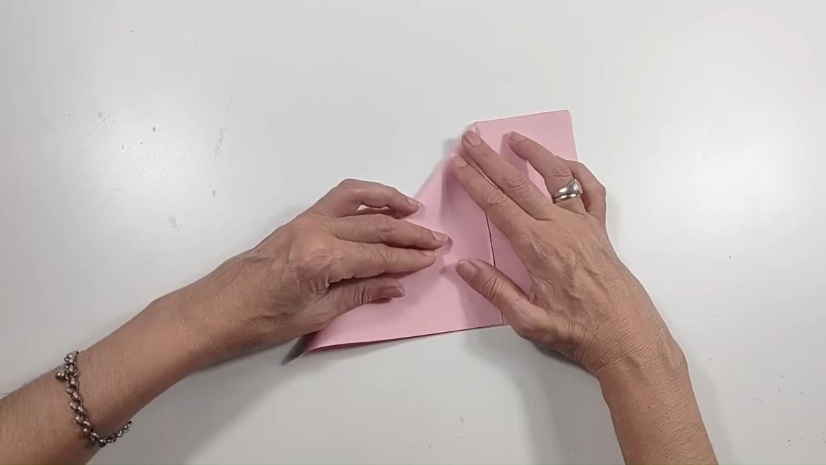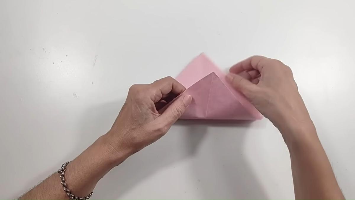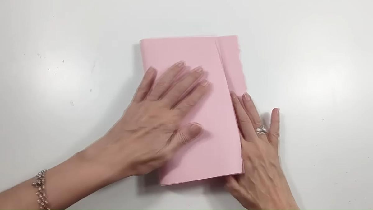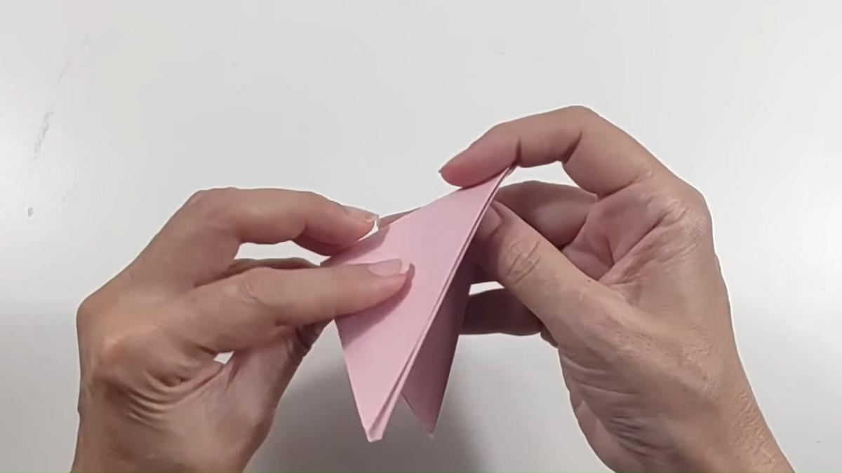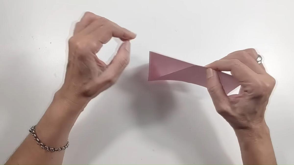 de la misma manera aplicaré la otra ahora quiero mostrarles como hice esta mariposa de papel para eso voy a usar estas hojas de colores que son de un grosor medio más finas que las cartulinas pueden utilizarlas de tonos pasteles similares a las pinturas que use antesvoy a doblar una por la mitad para sacar dos mariposas grandes y en cada parte voy a formar un cuadrado plegando de esta manera después voy a ir haciendo estos dobleces hasta que quede así voy a marcar bien este pliegue central hacia un lado y el otro