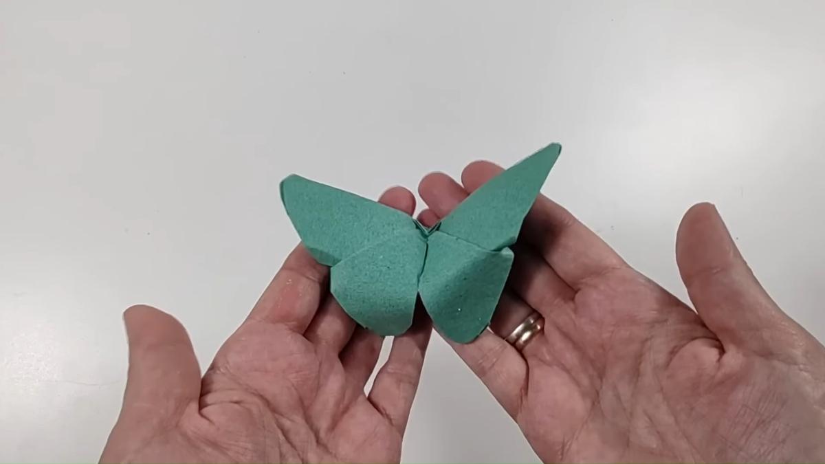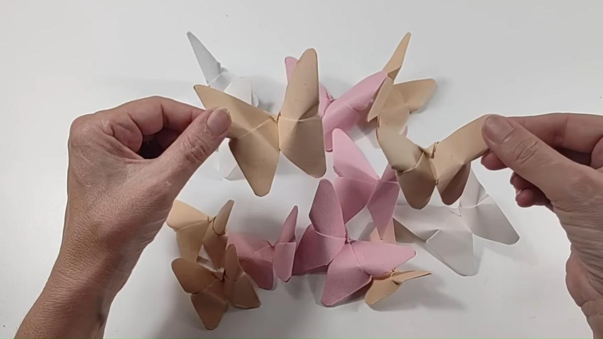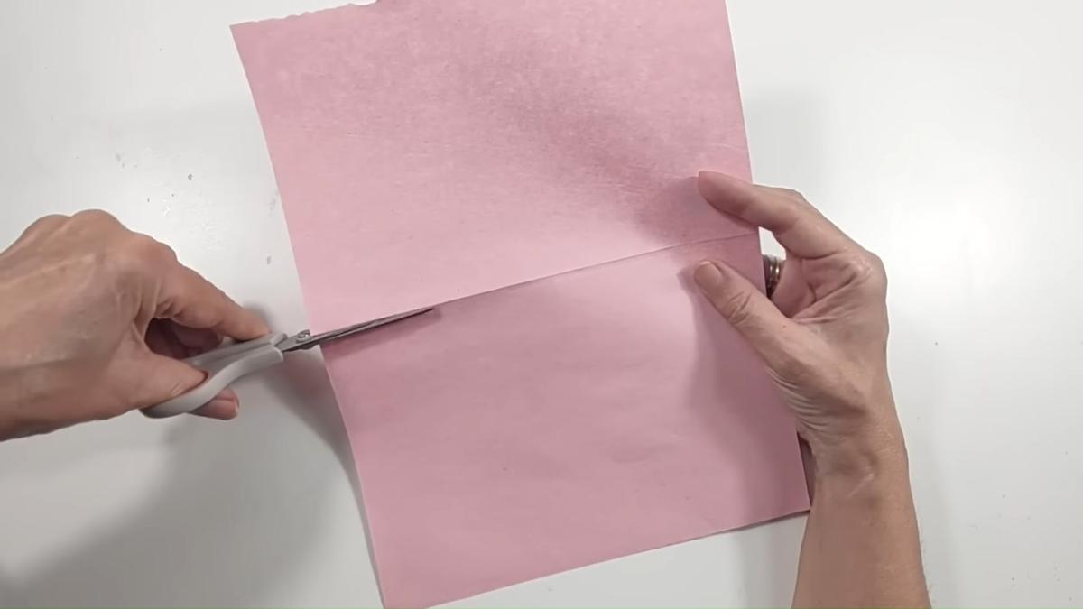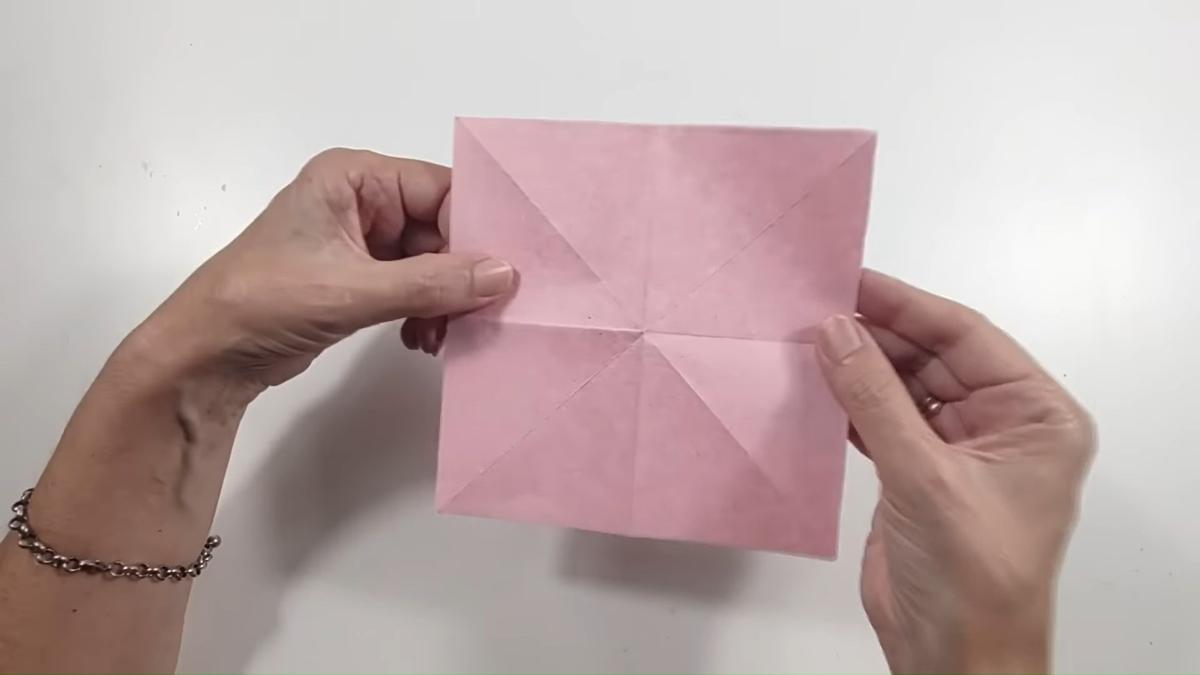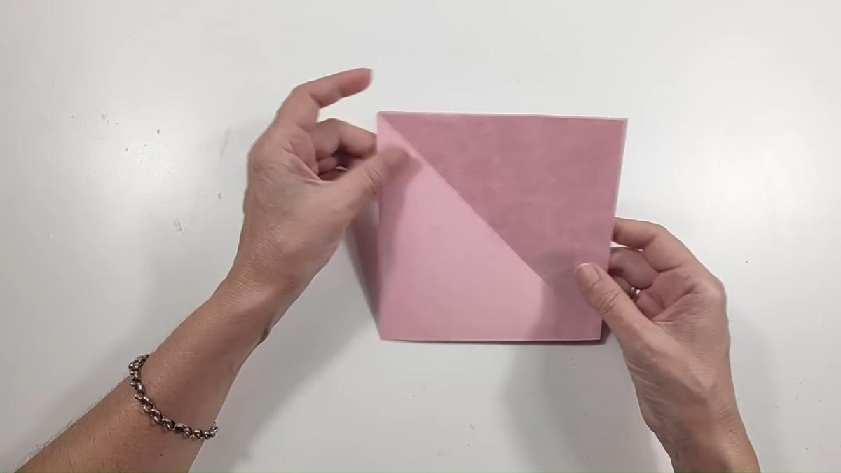 de la misma manera aplicaré la otra ahora quiero mostrarles como hice esta mariposa de papel para eso voy a usar estas hojas de colores que son de un grosor medio más finas que las cartulinas pueden utilizarlas de tonos pasteles similares a las pinturas que use antesvoy a doblar una por la mitad para sacar dos mariposas grandes y en cada parte voy a formar un cuadrado plegando de esta manera después voy a ir haciendo estos dobleces hasta que quede así voy a marcar bien este pliegue central hacia un lado y el otro