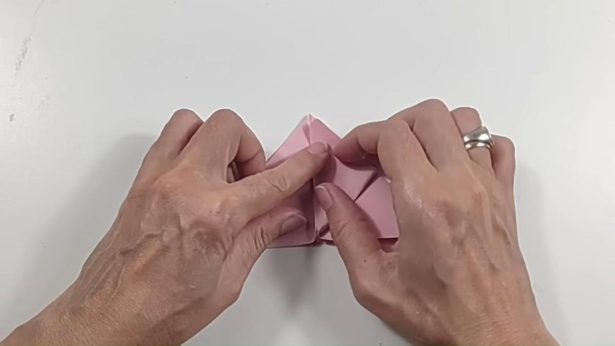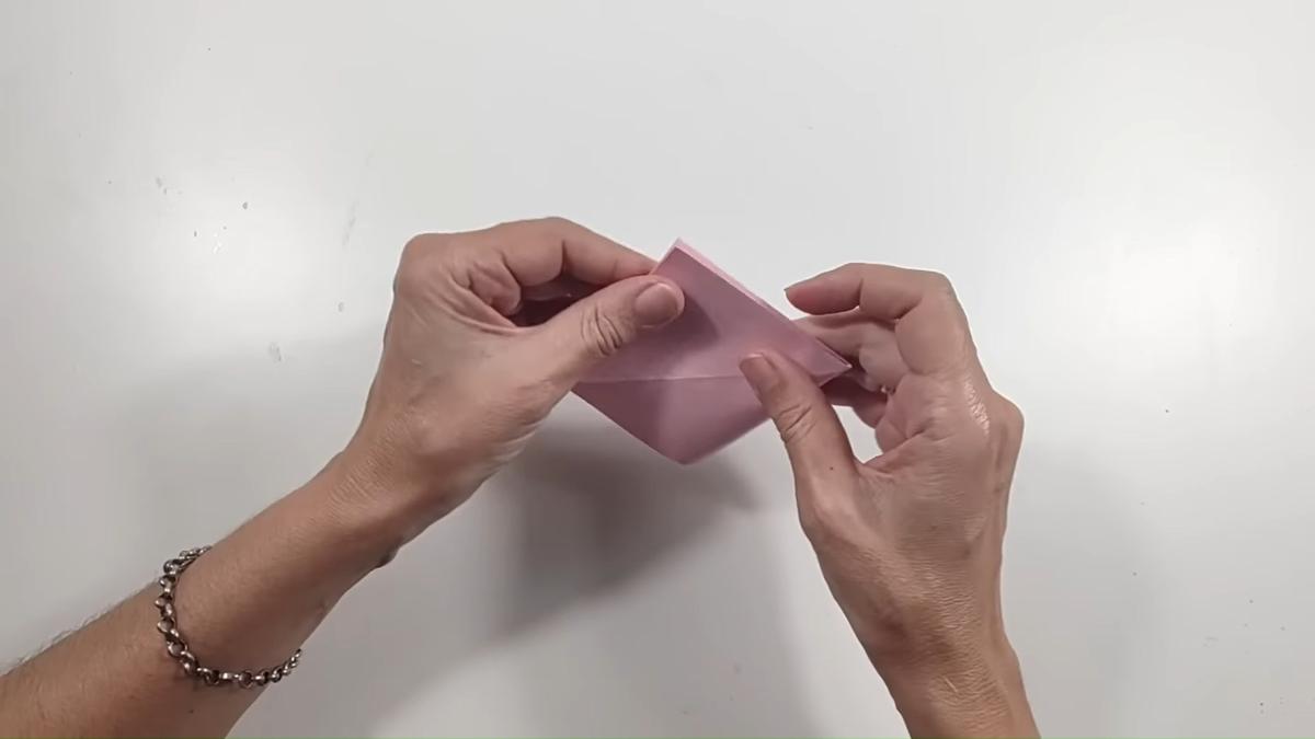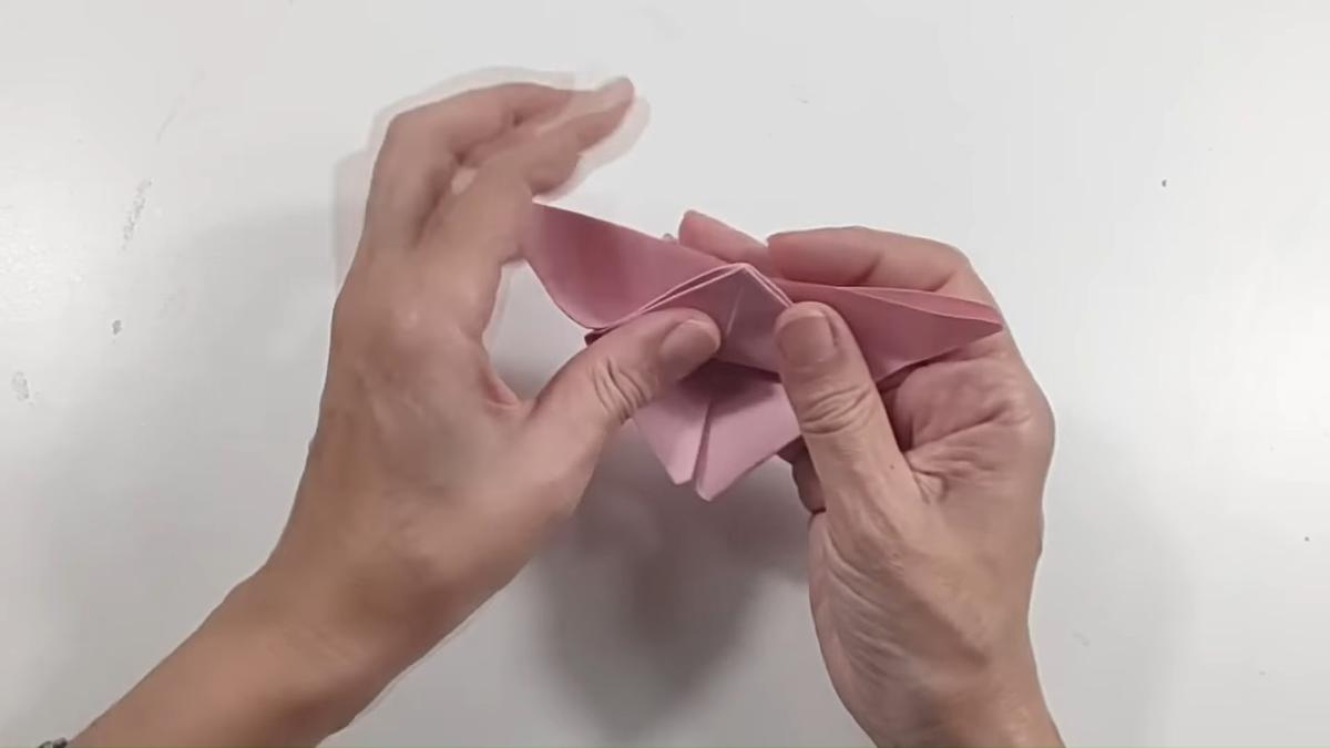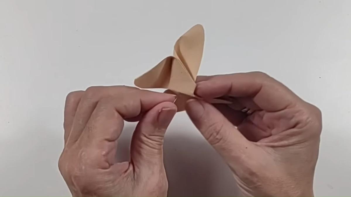 para que sea más fácil plegar de esta forma puedo hablar una vez más y hacer unas cortes redondeados en los extremos voy a abrir y al levantar estos lados hacia el vértice superior