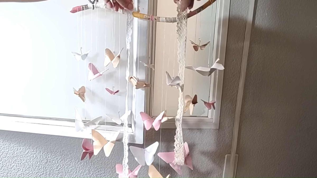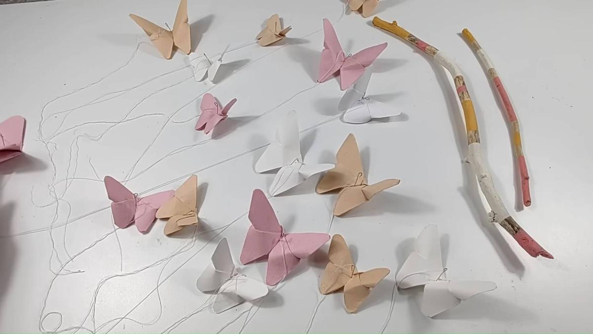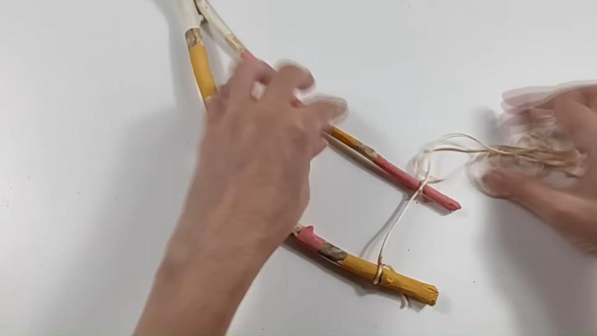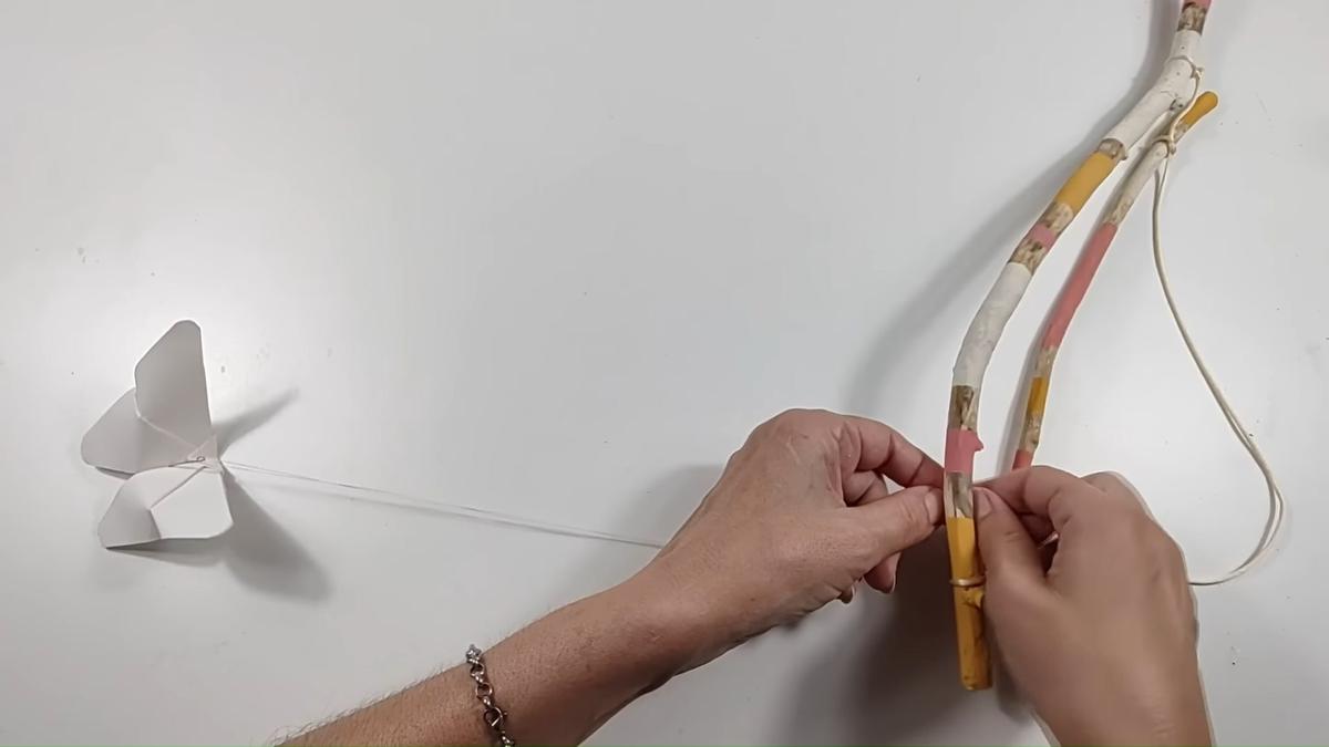 la idea es colocar las ramas así y armar el móvil de este modo con un cordón voy a unir las ramas para que quede como colgadordespués puede ir colgando las mariposas atandolas a la rama grande y fijando el nudo con un poco de pegamento de la misma manera voy a ir pegando el resto alternando colores y tamaños