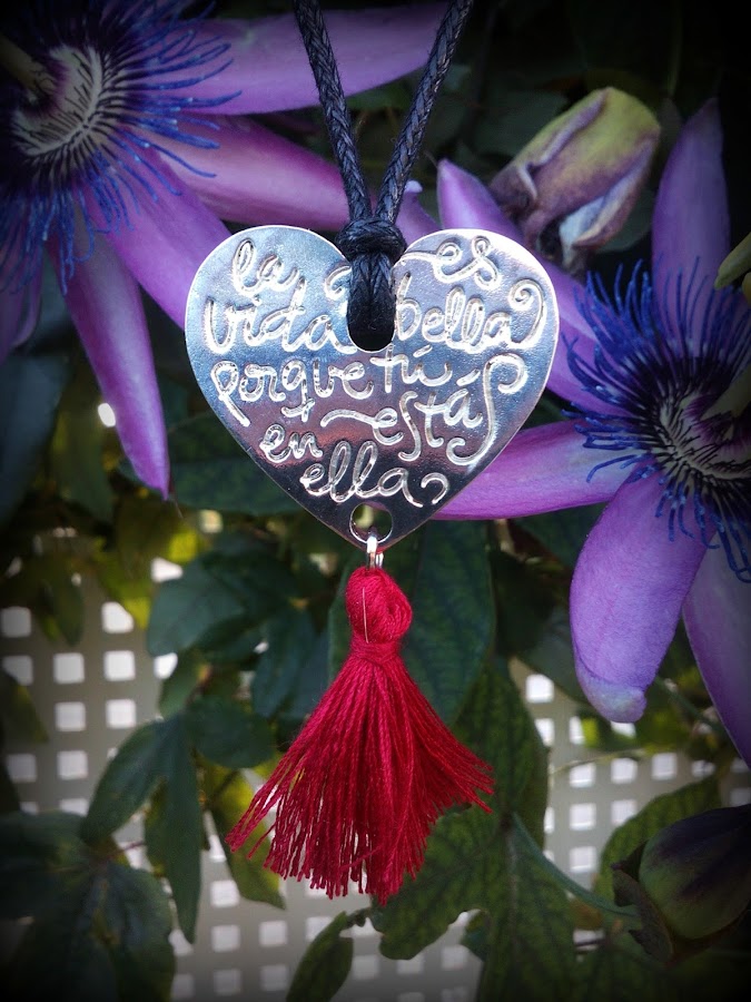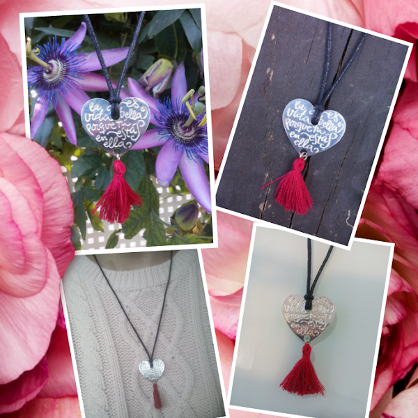En primer lugar os enseño un colgante que he hecho que es un corazón de plata con un bonito mensaje en el. Lleva un fleco en rojo que le da ese toque romántico. ¿Os gusta?