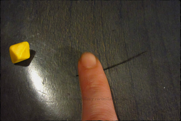 Con fimo negro, hacer un hilito con el dedo hacia delante y hacia atrás, rodándolo.