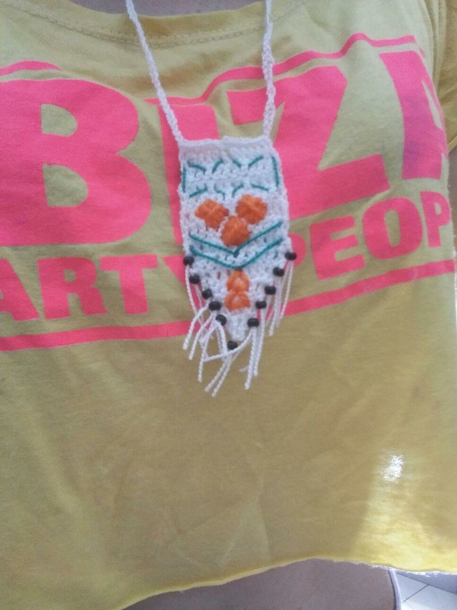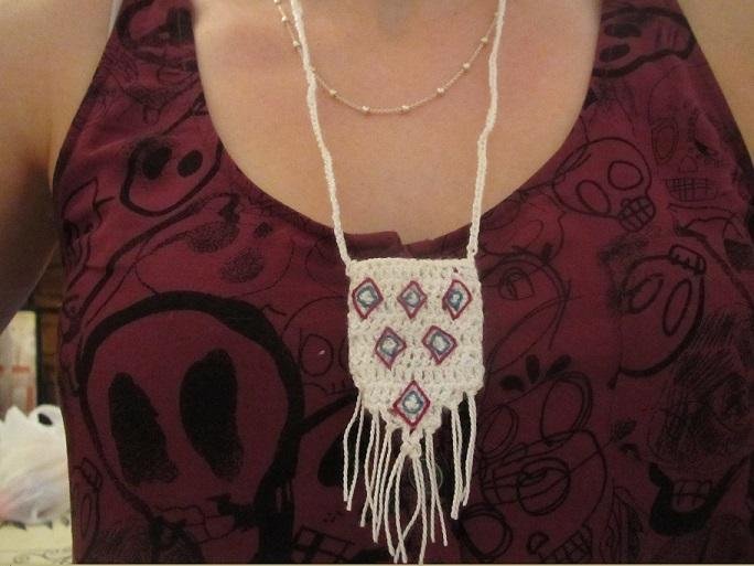 La cadena podemos ponérsela con enganches, argollas y cuerda pero en mi caso, la realizo de crochet haciendo una cadenera muy larga comenzando por el centro del golgante y volviendo al mismo punto. El bordado ya es cuestión de gustos por lo que puedes personalizarlo tanto como quieras.