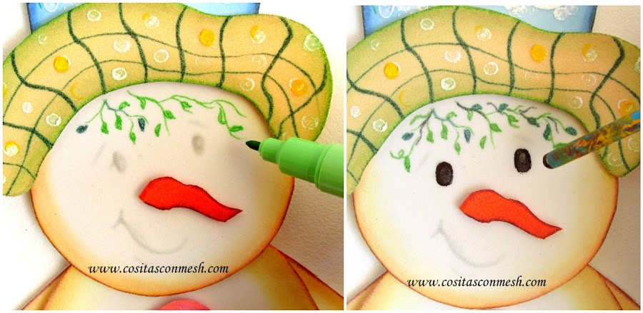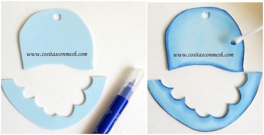 3.-Ahora procedemos a sombrear parte del sombrero, y de un adorno que lleva el muñeco en el cuerpo, estos 2 moldes irán en foami celeste, y sombreare con plumón azul y difumino con un hisopo.