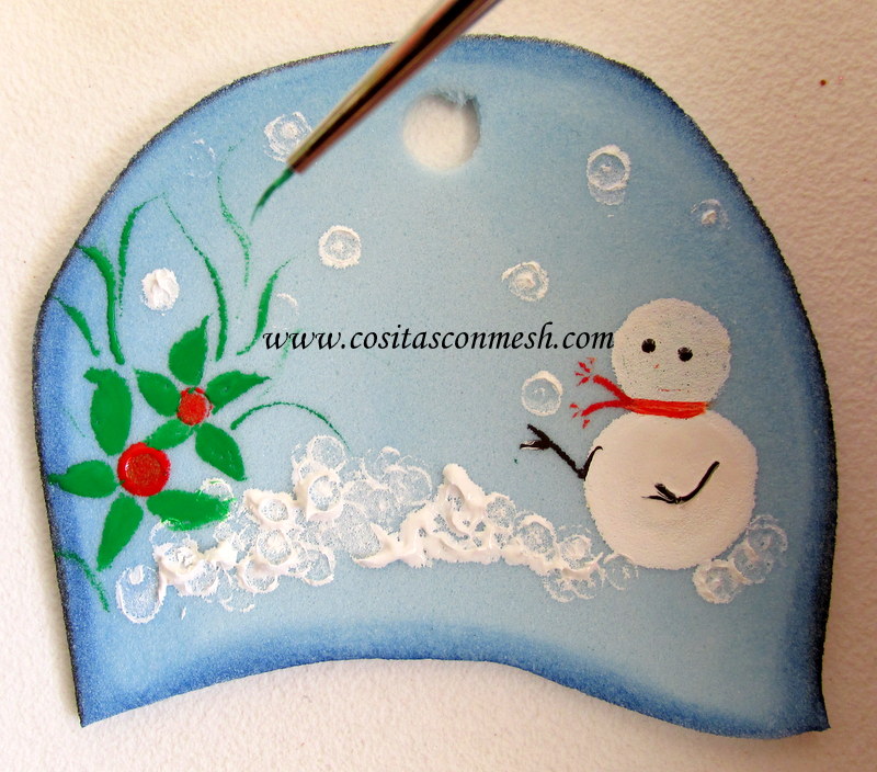 11.-Pego las letras de navidad que corte en foami fucsia diamantado, pego los moldes de una flor, y pinto unas hojitas, con pintura blanca de relieve, la esparzo en algunas zonas del muñeco para que parezca nieve, y eso es todo amigos, espero que les haya gustado mi colgante de muñeco de nieve para esta navidad :).