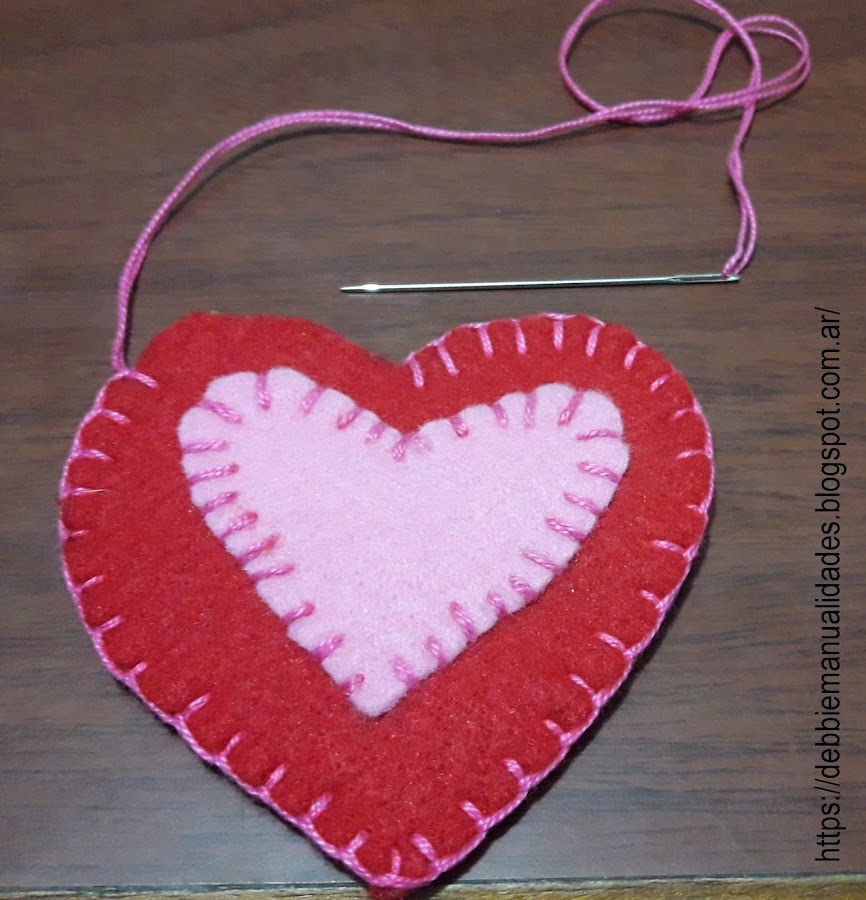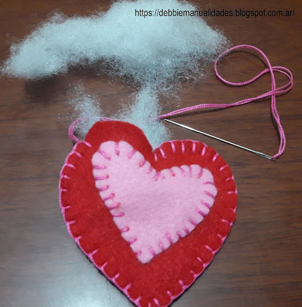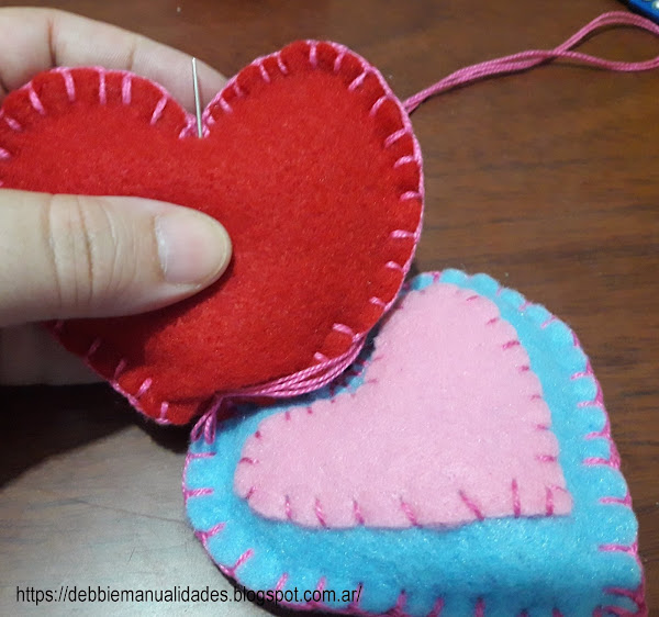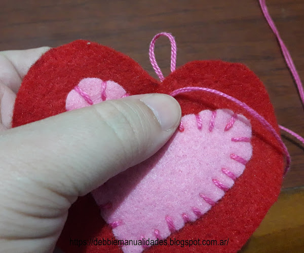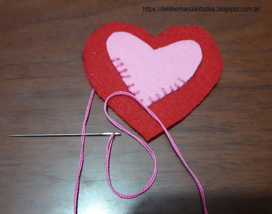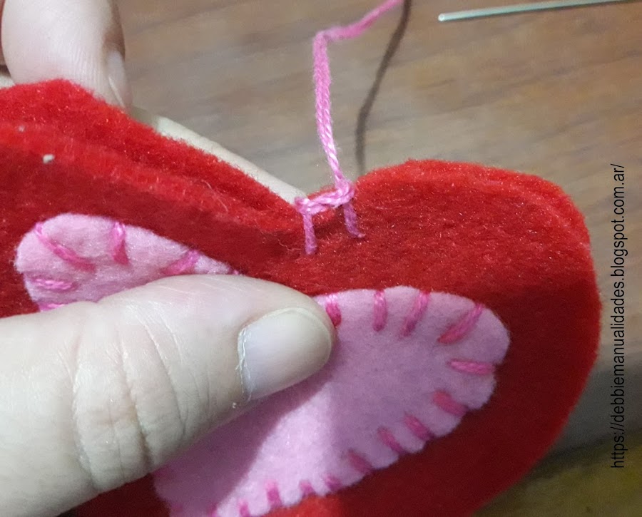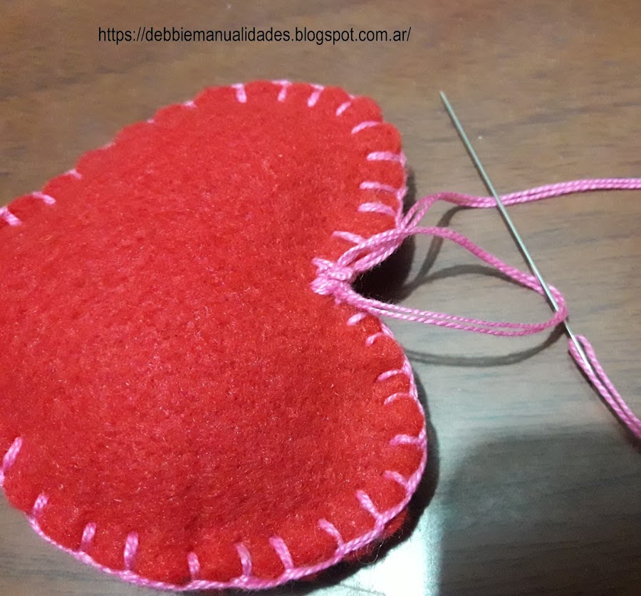 Ahora, ya con el corazón pequeño colocado en su sitio, toca empezar a unir las dos partes del corazón grande; para eso, lo hago con el punto festón.