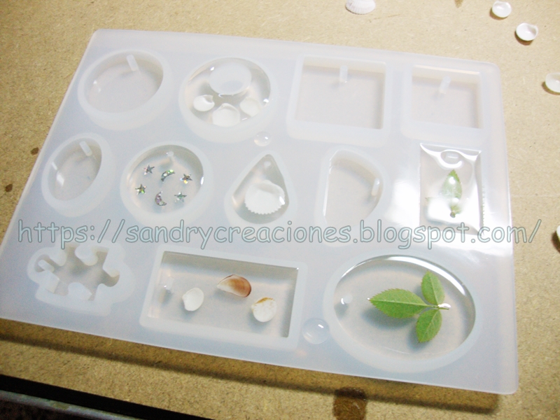 Antes de realizar la mezcla de resina prepararemos todo el material necesario, en este caso colocaremos un molde de silicona sobre una superficie plana, en un lugar donde no tenga que moverse hasta que se seque la resina, y prepararemos todos los objetos necesarios que queramos usar para encapsular en resina: conchas pequeñas, hojas, etc...