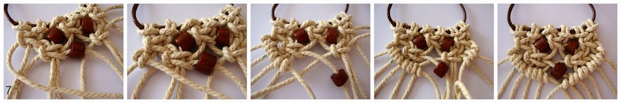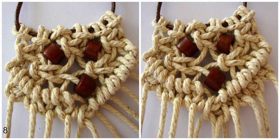 5- Retiramos las dos hebras de ambos laterales que dejamos en descanso y nos centramos en las otras 8 para trenzar nudos alternos. Estas 8 hebras centrales las dividimos en 2 y hacemos de nuevo un nudo plano a cada lado (nos quedan bajo los abalorios).
